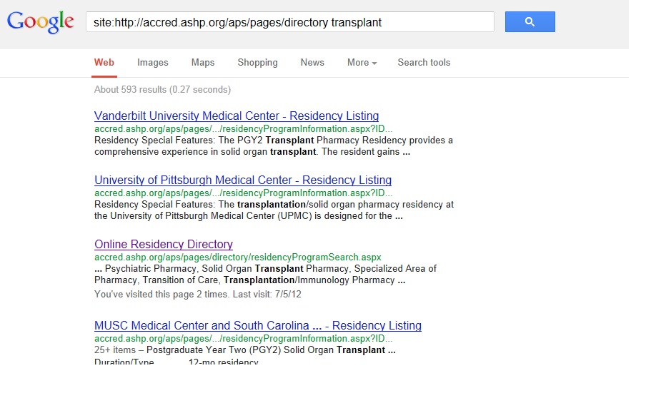 The searching abilities of ASHP's online residency directory are very limited. If one wants to search things other than city, state, zip or program name from the gigantic list of PGY-1s, some additional tricks are necessary. Google lets you search within a web domain. All pages within the residency directory are within the same web site domain, which lets you search by keywords within that domain. Here's how it works.